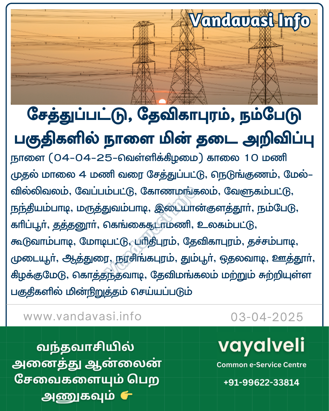 திருவண்ணாமலை மாவட்டம், தேவிகாபுரம், சேத்துப்பட்டு, அப்பேடு, தச்சம்பாடி ஆகிய துணை மின்நிலையங்களில் மாதாந்திர பராமரிப்பு பணிகள் மேற்கொள்ளப்பட இருப்பதால் நாளை (வெள்ளிக்கிழமை) காலை 10 மணி முதல் மாலை 4 மணி வரை சேத்துப்பட்டு, நெடுங்குணம், மேல்வில்லிவலம், வேப்பம்பட்டு, கோணமங்கலம், வேளுகம்பட்டு, நந்தியம்பாடி, மருத்துவம்பாடி, இடையான்குளத்தூர், நம்பேடு, கரிப்பூர், தத்தனூர், கெங்கைசூடாமணி, உலகம்பட்டு, கூடுவாம்பாடி, மோடிபட்டு, பரிதிபுரம், தேவிகாபுரம், தச்சம்பாடி, முடையூர், ஆத்துரை, நரசிங்கபுரம், தும்பூர், ஒதலவாடி, ஊத்தூர், கிழக்குமேடு, கொத்தந்தவாடி, தேவிமங்கலம் மற்றும் சுற்றியுள்ள பகுதிகளில் மின்நிறுத்தம் செய்யப்படும் என அறிவிக்கப்பட்டுள்ளது.